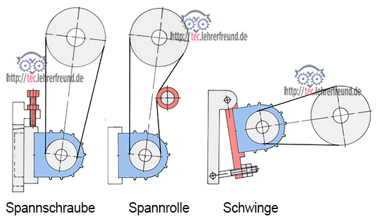Bei einfachen Riementrieben erzeugt man die erforderliche Riemenspannung durch Spannschrauben, Spannrollen oder durch Schwenken des Antriebsmotors.