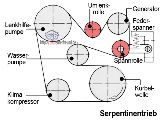 Moderne Pkw-Motoren sind mit so genannten Serpentinen-Trieben ausgestattet (Serpentine = Schlangenlinie). Dabei treibt ein einziger Keilrippenriemen mit automatischer Spannvorrichtung die Nebenaggregate (Lüfter, Wasserpumpe, Generator, Lenkungs-Servopumpe und Klimakompressor) an. Gegenüber einem Antrieb von mehreren Keilriemen bedeutet der Serpentinentrieb eine deutliche Platzersparnis und lässt so eine kompakte Bauweise zu.