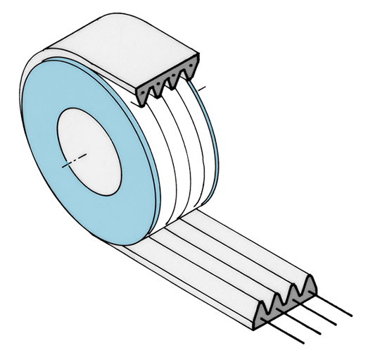 Keilrippenriemen sind eine Mischform aus Flachriemen und Keilriemen. Der Riemen besitzt in Laufrichtung angeordnete Rippen, die von entsprechenden Rillen in der Riemenscheibe geführt werden. Die Zugkräfte werden von den im Riemenmaterial eingebetteten Zugsträngen übertragen.