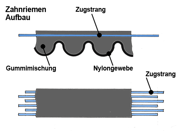 Die Kraftübertragung übernimmt der im Zahnriemen eingebettete Zugstrang, der meist aus Glas- oder Aramidfasern besteht. Die Innenseite des Zahnriemens besteht aus abriebfestem Gewebe; es schützt die aus Elastomer bestehenden Zähne vor Verschleiß. Die exakte Einhaltung der Steuerzeiten verbietet jede Veränderung der Winkellage von Nocken- und Kurbelwelle.