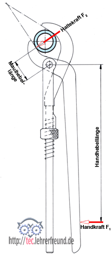 Die Kräfte stehen im umgekehrten Verhältnis zu den Hebellängen: Vergrößert man die Handhebellänge, dann wird die Handkraft F1 (bei gleicher Haltekraft F2) kleiner. Bei einem Hebelverhältnis 20 : 1 ist die Haltekraft F2 (am kleineren Hebel) 20 Mal größer als die Handkraft F1.