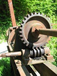 Das Foto unten zeigt den Antrieb einer alten Wasserstellfalle. Das Übersetzungsverhältnis hier ist 30:1. Die gezeigte Fotoansicht würde in der Zeichnung oben der Ansicht von rechts entsprechen.
