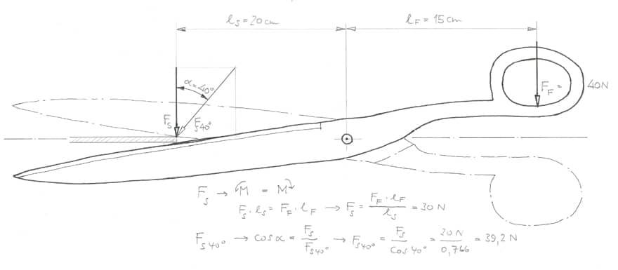 ich habe da auch eine Frage zum Drehmoment. Wenn ich nun das Drehmoment einer Schere ausrechnen möchte, bei der die Strecke vom Drehpunkt zur “Scherenspitze”  20cm lang die die Strecke von dem Punkt bis zu den Löchern für die Finger 15 cm lang ist und die Kraft die ich drücke 40 N beträgt, kann ich das ja mit dem Hebelgesetz für zweiseitige Hebel ausrechnen. Wenn ich da aber noch den Winkel mit einbeziehen muss, zum Beispiel 40°, weiß ich nicht wie oder was ich da rechnen muss.
