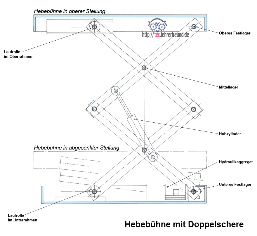 Ist die Schere ganz hochgefahren, dann wirkt die Last FG an den Gelenken I und III, die halbe Last FG/2 an den Gelenken II und IV.