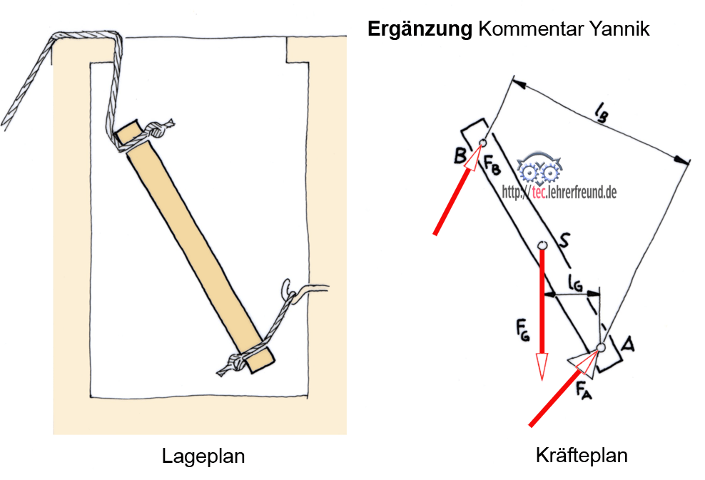 Wenn wir Yaniks Anordnung richtig begriffen haben, sieht sie ungefähr aus wie in der folgenden Skizze. Im Kräfteplan sind die auf das Brett wirkenden Kräfte mit ihren Hebelarmen eingezeichnet. FG ist das in Brettmitte angreifende Brettgewicht. Als Drehpunkt haben wir A gewählt. Aus der Momentengleichung