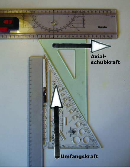 Am oberen Lineal wird ein 30- oder 45°-Zeichendreieck angelegt. Dann verschiebt man das dagegen gelegte Zeichendreieck als Symbol für die antreibende Umfangkraft entlang des linken Lineals nach oben. Dabei weicht das obere Zeichendreieck nach rechts aus.