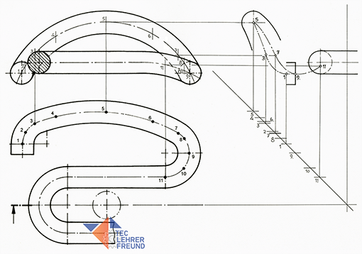 Aufgabe 2. Die Seitenansicht muss punktweise konstruiert werden. Wir haben dafür in der Draufsicht 11 Punkte ausgewählt. In der Seitenansicht haben wir nur den Verlauf der Mittellinie zwischen 1 und 11 gezeichnet. Damit die Zeichnung nicht zu unübersichtlich wird, wurden die von den Punkten 2, 4, 6, 8 und 10 ausgehenden Projektionslinien weggelassen.