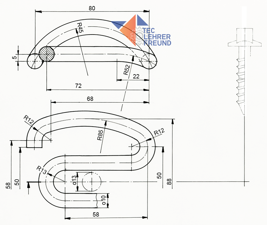 Anmerkung: Die Mittelpunkte der Radien R 45, R 52 und R 85 müssen durch Konstruktion gefunden werden.