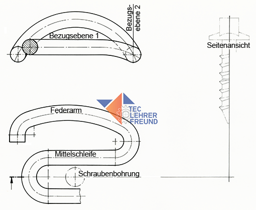 Anmerkung: Wo gebogene Teile der Spannklemme nicht parallel oder senkrecht zur Zeichenebene liegen, erscheinen sie in den Ansichten verzerrt. In unseren Zeichnungen haben wir die Kurven als Kreisbögen dargestellt. In (zulässiger) Annäherung an die Originalform erleichtern sie das Zeichnen erheblich. Dabei ist zu beachten, was man im tec.LF über Kreisanschlüsse findet.