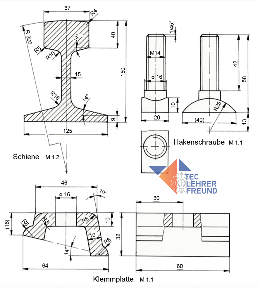 Zeichnen Sie in Ansichten und bemaßen Sie die Einzelteile Schiene, Rippenplatte, Klemmplatte und Hakenschraube.