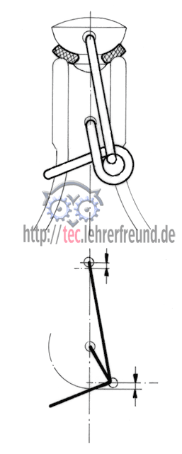 In diesem Punkt wirkt die Kraft nur auf die Lagerstellen des Mechanismus, eine Bewegung der Hebel ist ohne äußere Einwirkung nicht möglich. Erst eine Kraft quer zur Hauptachse des Mechanismus ändert diesen Zustand.)