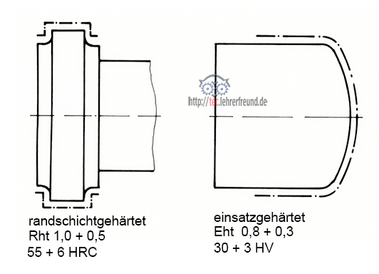 b) Bei Oberflächen-Härteverfahren wie dem Randschichthärten oder dem Einsatzhärten kennzeichnet man den zu härtenden Bereich mit einer beiten Strichpunktlinie; sie liegt außerhalb der Härtekontur. In einem Zusatztext wird die Art der Wärmebehandlung und die Härtungsstiefe mit z. B. Eht und Rht angegeben.