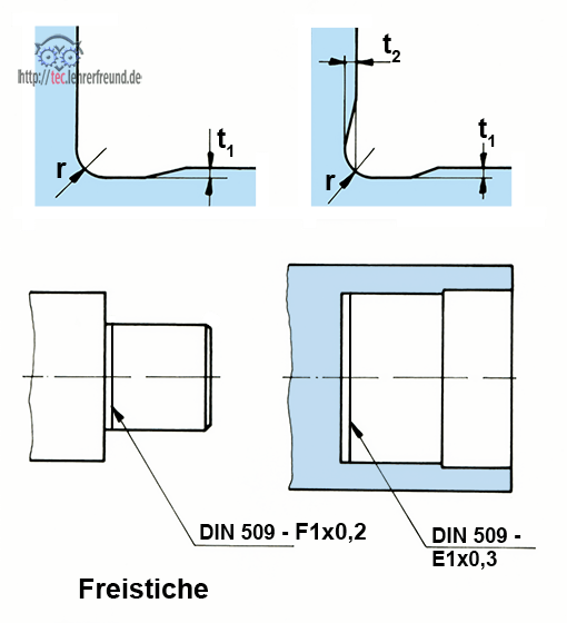 – Der Freistich verlegt den Übergangsradius hinter die Stirnfläche bzw. unter den Wellendurchmesser und verhindert so die der Festigkeit abträgliche Kerbwirkung.