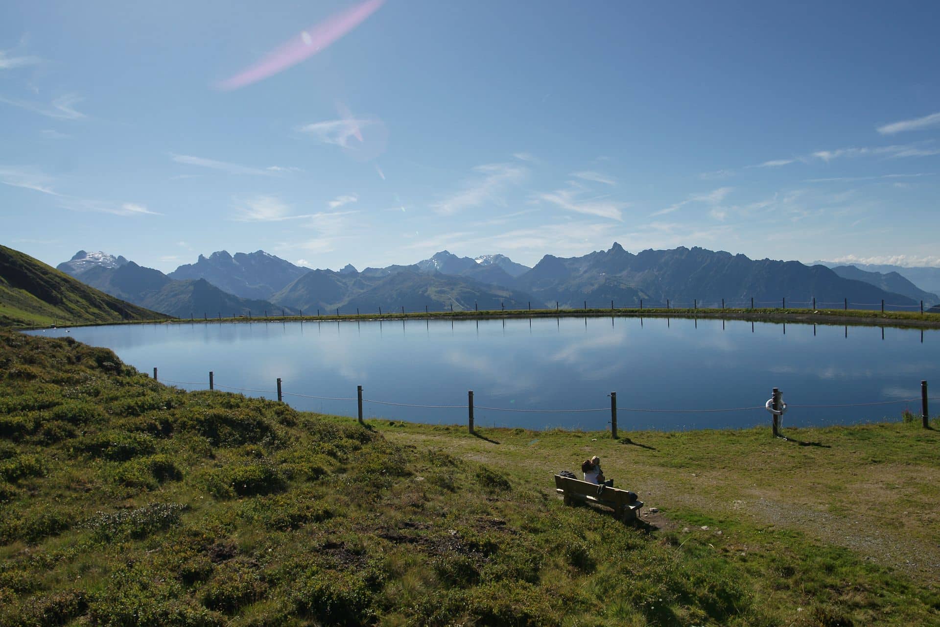Bild: Der Speichersee Hochjoch liegt in 1 985 m Höhe und unterhalb dem gleichnamigen Hochjoch (2 520m). Er beliefert im Winter die Beschneiungsanlagen im Skigebiet.