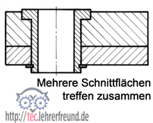 Führt der Schnitt durch mehrere parallele, versetzte Ebenen, so werden die Schnittverlaufslinien geknickt. Jeder Schnitt wird so gezeichnet, als ob die Flächen in einer Ebene lägen. Der Schnitt wird mit zwei gleichen Großbuchstaben gekennzeichnet. Sie werden eine Schriftgröße größer als die Bemaßung geschrieben.