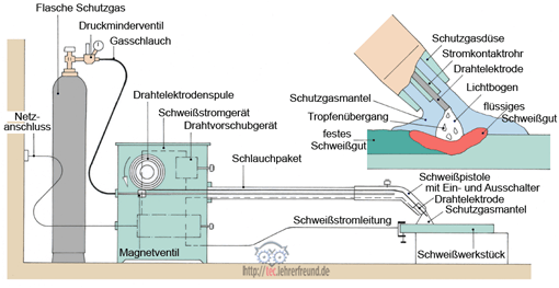 Das MAG-Schweißen (Metallschweißen mit aktiven Gasen) verwendet entweder reines CO2 oder ein Mischgas aus Argon und geringen Anteilen CO2 und O2. Das MAG-Verfahren wird in erster Linie bei unlegierten und niedrig legierten Stählen eingesetzt, das MIG-Verfahren bevorzugt bei höher legierten Stählen und Aluminiumlegierungen.