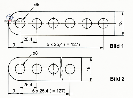 Gleiche, sich wiederholende Formelemente werden nur einmal dargestellt und bemaßt wie in Bild 4 (Schlitz mit abschließender Bohrung). Die übrigen Formelemente werden dann vereinfacht gezeichnet und z. B. durch Mittellinien angedeutet.