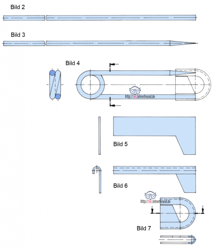 Die Bilder zeigen verkürzt die Arbeitsschritte bei der Herstellung einer Sicherheitsnadel. Beschreibe die Arbeitsschritte.