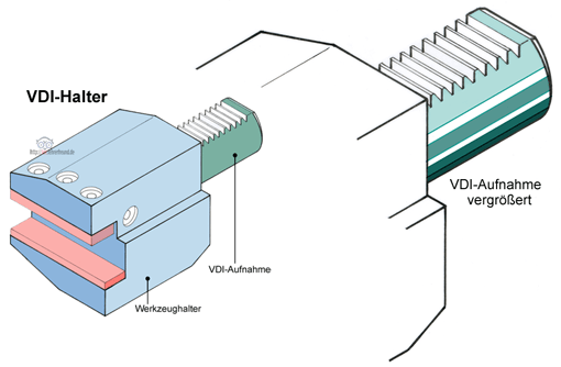 Das Haltesystem hinter dem Spannsystem ist der genormte VDI-Halter. Der zylindrische Zapfen der VDI-Aufnahme besitzt eine Verzahnung, die über eine Schnecke an die Revolverscheibe angepresst wird. Diese Konstruktion gewährleistet eine hohe und verlässliche kraftschlüssige Verbindung. Das Werkzeug wird zentral durch die Aufnahme gekühlt.