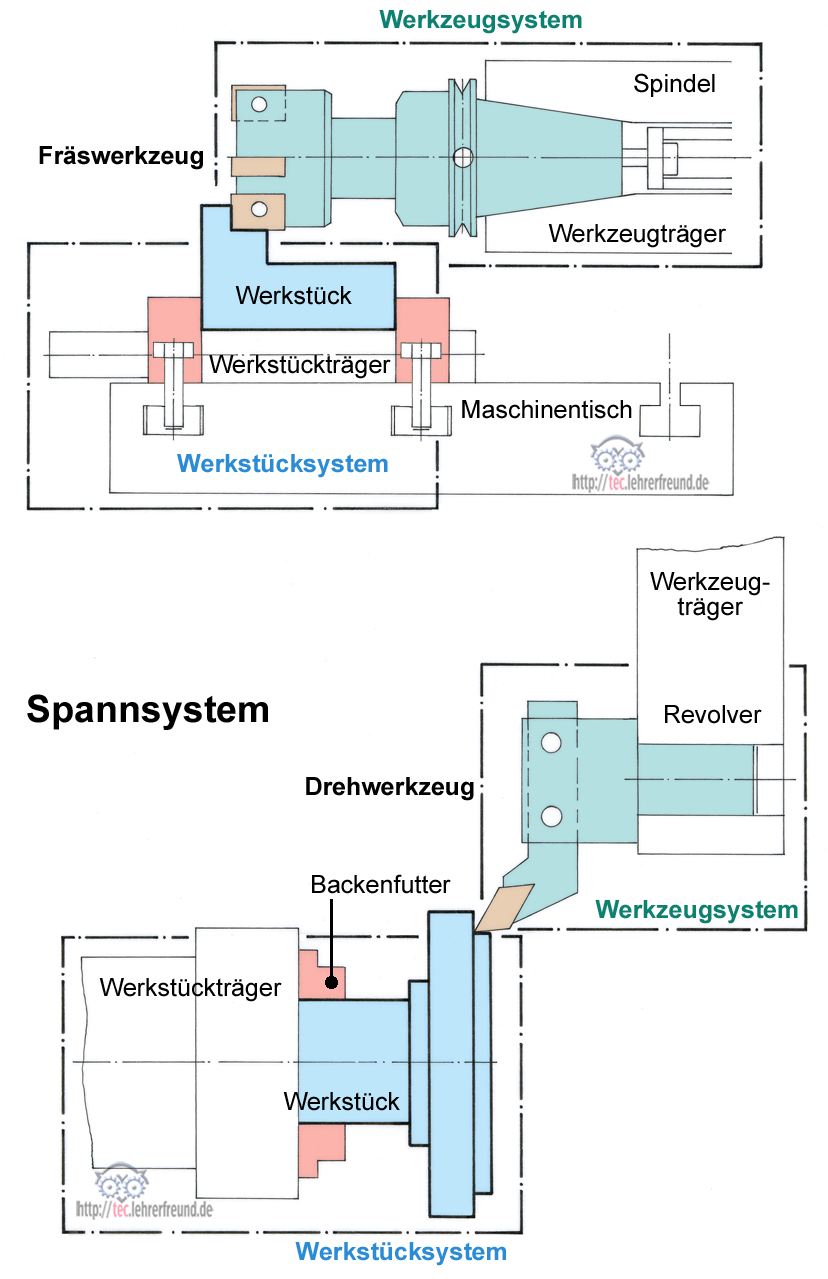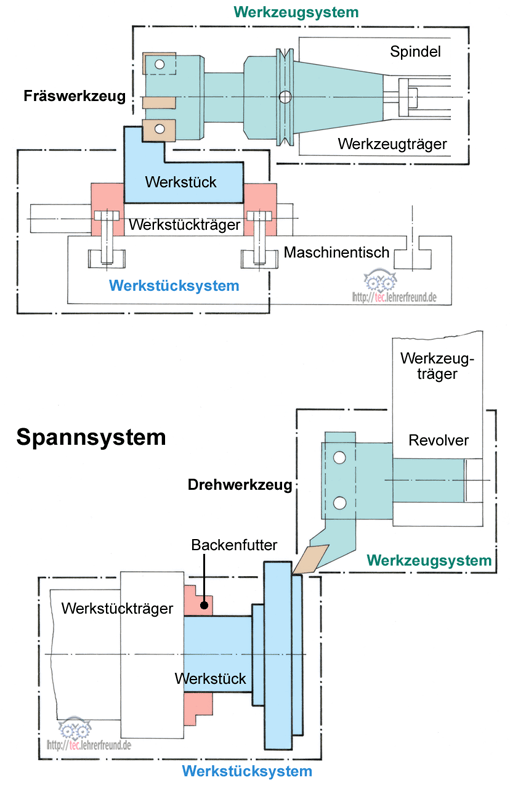 In jedem Fertigungsverfahren wirken zwei Systeme zusammen: Das Werkstück (WS) und das Werkzeug (WZ). Dabei bewegen sich die beiden relativ zueinander. Dieses System ist das Kernstück jeder Werkzeugmaschine.