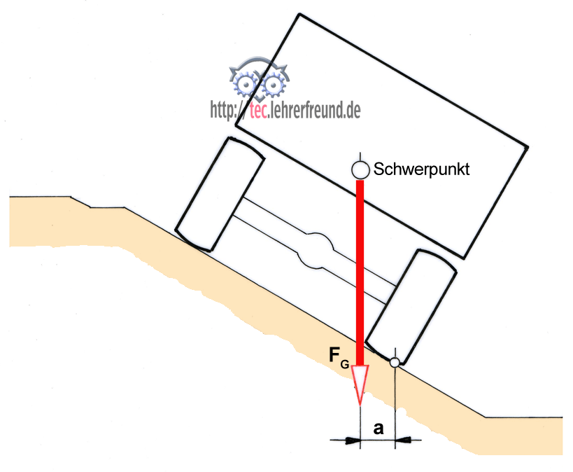 b) Der Lkw stürzt nicht um, weil der Schwerpunkt links von der Kippkante liegt (Maß a)