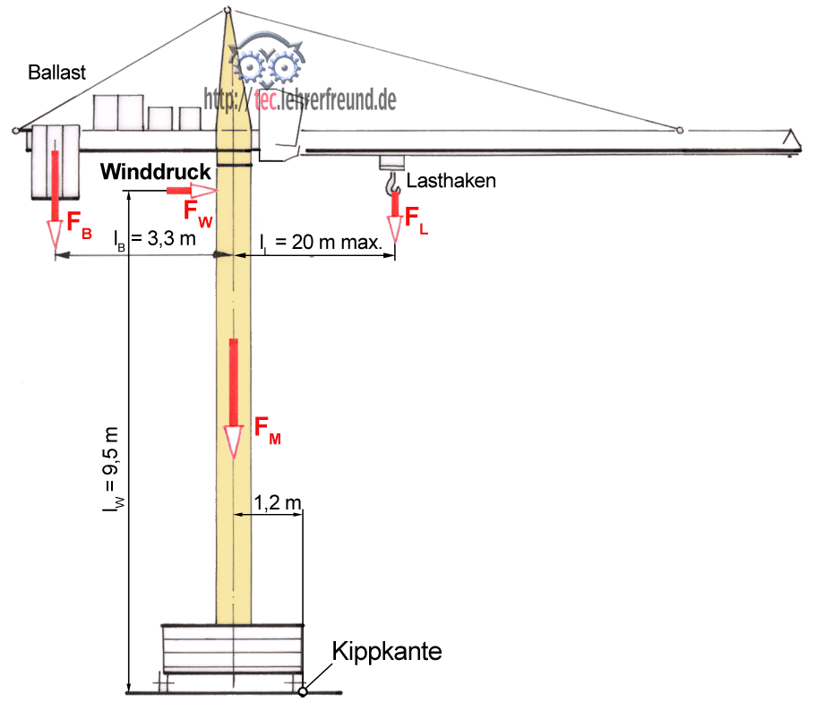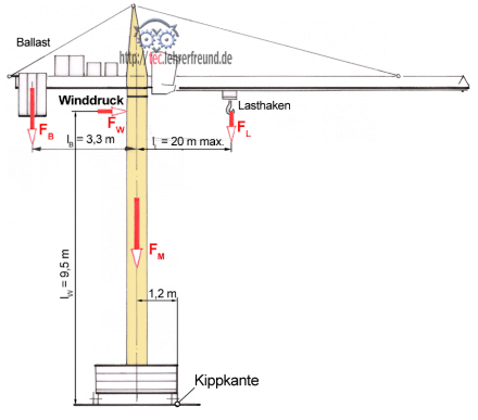 Der Baukran hat ein Ballastgewicht FB = 2,25 t = 2 250 daN. Mast und Betonfuß wiegen zusammen FM = 2 800 daN. Der Winddruck wird mit FW = 3 200 N angenommen.
