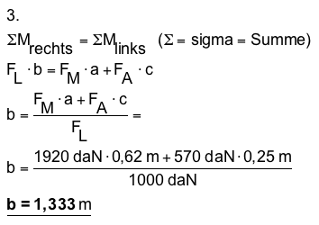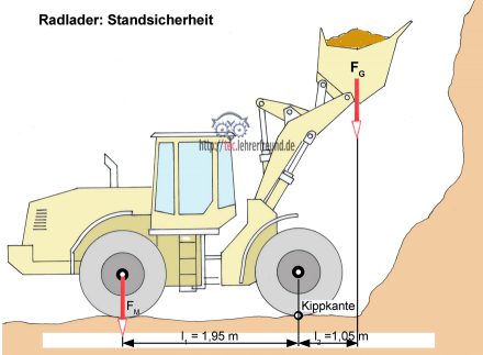 Standsicherheit S = Mlinks : Mrechts = FM ∙ lm : FG ∙ lG =  (2 850 daN ∙ 1,95 m)  : (1 400 daN ∙ 1,05 m) =