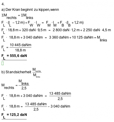 b) Wie groß darf die Last bei lL = 20 m höchstens sein, wenn eine Standsicherheit von 2,5 gefordert wird?