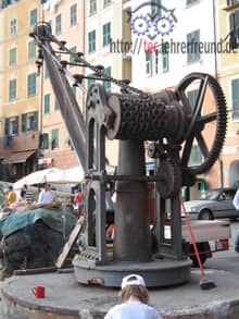 Das Bild eines Uraltkrans zeigt das Gegenstück: Das Übersetzungsverhältnis zwischen den beiden Stirnrädern beträgt 8 : 1 mit einem riesengroßen Abtriebsrad.