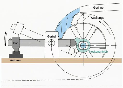 Mit der Einführung des Wasserrades an Flüssen und Bächen im Mittelalter begann ein unaufhaltsamer Prozess der Mechanisierung von Arbeitsvorgängen. Zunächst wurde das unterschlächtige Wasserrad verwendet und seit dem 14. Jahrhundert jenes mit oberschlächtiger Wasserführung, wobei die gesamte Wassermenge von oben auf die Schaufeln drückte, was die Leistung verdoppelte. Mühlen mahlten Getreide, Senf und Quarzsand, stampften Textilien für die Papierherstellung und Schießpulver, walkten Tuche, pochten1) Erz und Knochen, rührten Farben und Tone, zwirnten Seide, trieben Schmiedehämmer und Blasebälge,