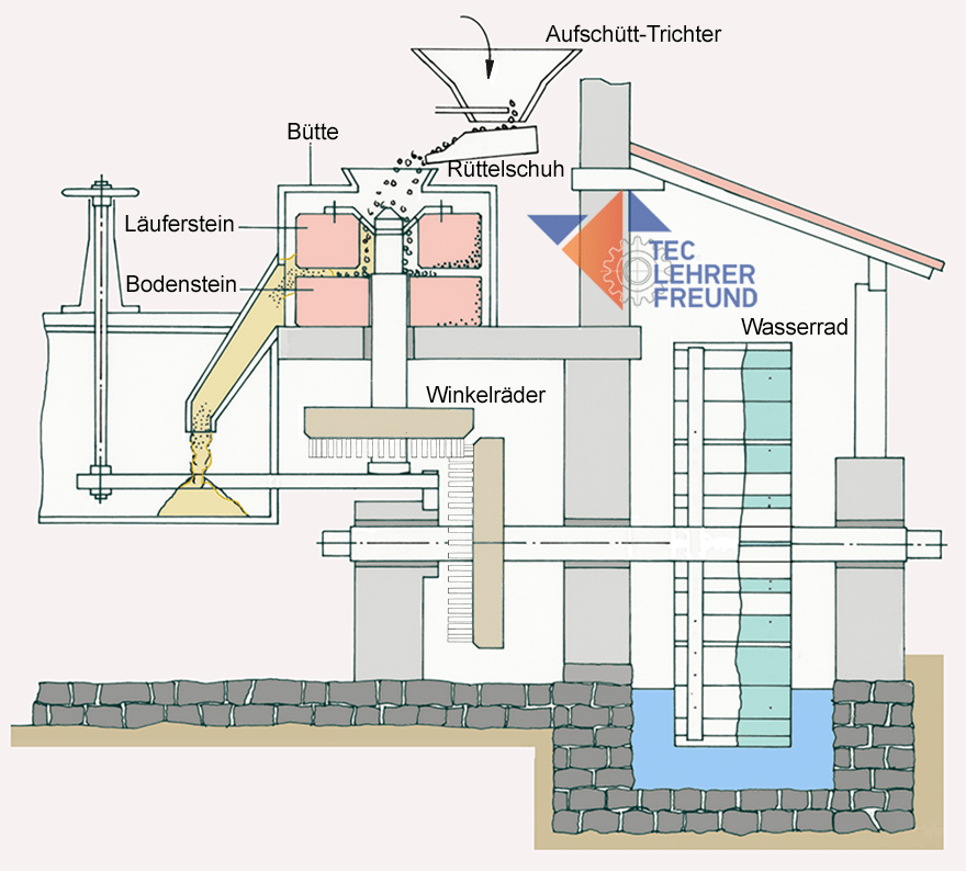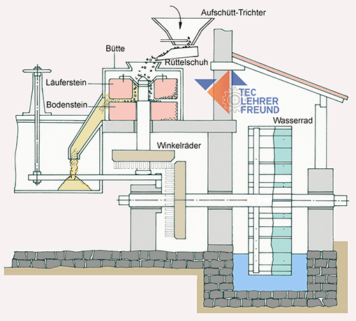 Bild: Getreidemühle, vereinfachte Darstellung, unterschlächtiges Wasserrad