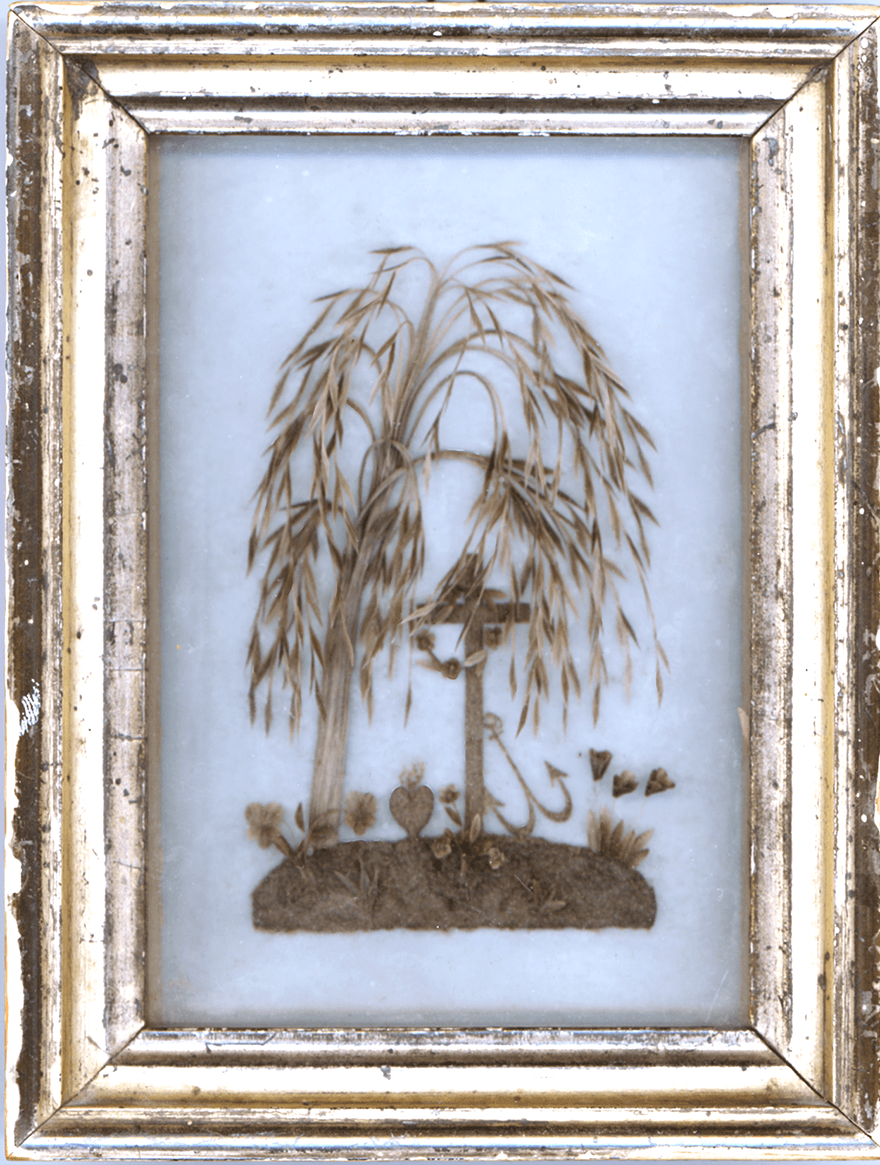 Das Foto zeigt ein kleines Kunstwerk, das vielleicht die Mutter aus den Haaren ihres so unglücklich ums Leben gekommenen Sohnes angefertigt hat (Original-Bildgröße außen 12,0 x 15,5 cm).
