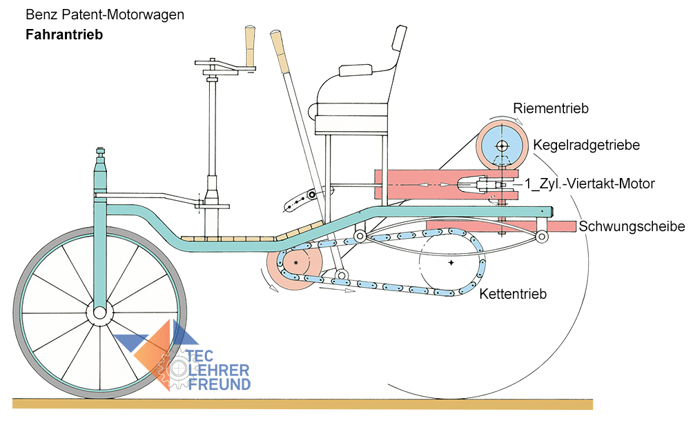 Fahrantrieb: Ein liegender Einzylindermotor mit Kurbeltrieb treibt das Kegelritzel an. Den unvermeidlich unruhigen Lauf des Einzylindermotors dämpft eine massive Schwungscheibe. Das Tellerrad (blau) lenkt den Trieb in die Horizontale. Ein Riementrieb mit geschränkter Riemenführung bringt den Antrieb auf die Vorgelegewelle links unten; von dort aus treibt ein Kettentrieb die Hinterräder an.