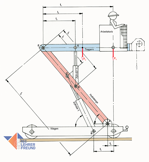 Mithilfe einer Skizze sind Kräfte zu berechnen. In die Skizze des Tragarms sind die Kraftrichtungen einzutragen.