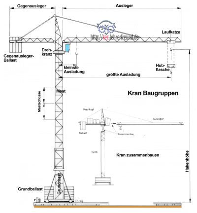 Der Obendreher besteht aus den im Bild dargestellten Baugruppen, die auf der Baustelle zumeist mit Hilfe von Autokranen montiert werden. Auf dem Krankopf mit Gegenausleger sind untergebracht: