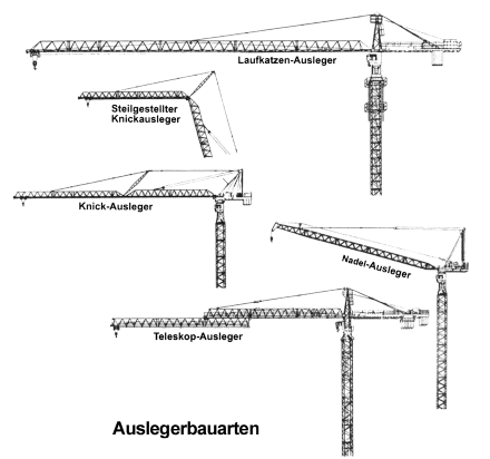 Die meisten auf deutschen Baustellen arbeitenden Turmdrehkrane sind Krane mit Laufkatzausleger. Dieser ist waagerecht am Kranturm montiert. Der Lastentransport erfolgt mit Hilfe einer Laufkatze, welche auf den Basisschienen des Auslegers fährt und das Hubseil mit sich führt.