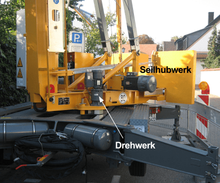 Schnellmontagekrane werden zusammengeklappt zur Baustelle gefahren und dort mit im Kran eingebauten Montagewinden aufgestellt.