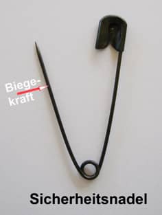 Will man eine offene Sicherheitsnadel schließen, dann muss die Nadel zur Schließe hin gebogen werden. Hier wirkt also eine Biegekraft.