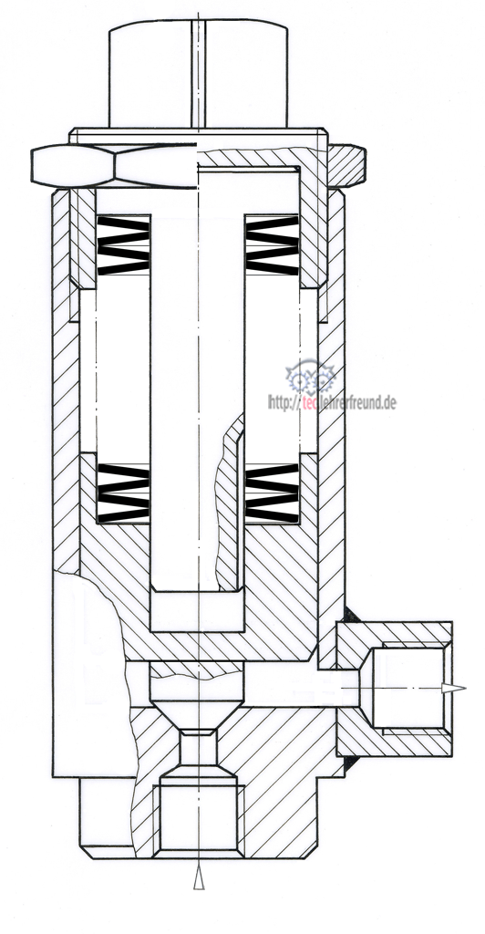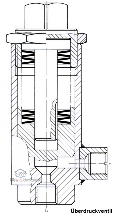 Gegeben ist ein Überdruckventil mit Tellerfedersäule. Pfeile kennzeichnen die Richtung des Ölstroms.