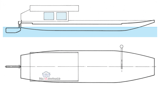 Bild 2: Die auf die rechte Bootsseite auftreffende Strömung erzeugt an der Bootswand Kraftkomponenten nach links. Die weitere Drehung wird durch die Anpassung der Ruderblattstellung gesteuert.