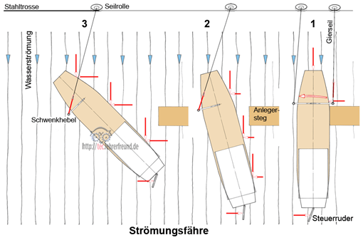 Da ist ein Fehler passiert, ihre Skizze ist falsch. Wie Michael richtig beschreibt: der Schwenkhebel befindet sich auf der dem Ziel entgegengesetzten Bootsseite (das Seil liegt nicht quer über der Fähre während der Fahrt). Ich muss es wissen, ich bin Fährfrau.