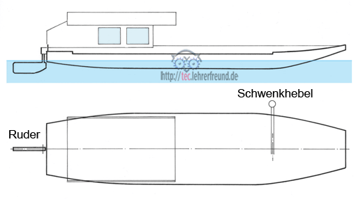 Bild 1: Die Fähre hat am rechten Ufer angelegt. Der Schwenkhebel ist noch in der rechten Stellung; das Ruder ist so gedreht, dass sich eine Kraftkomponente zum Ufer hin ergibt. Vor dem Ablegen wird der Schwenkhebel nach links gelegt (er zeigt also zu der Seite, auf die man fahren will). In dieser Schwenkhebelposition entsteht ein Drehmoment, das das Bootsheck vom Ufer weg dreht. Der Fährmann gibt dem Boot über eine am Anleger installierte Stange einen zusätzlichen Schub nach links, so dass sich die Fähre etwa in die Strömung stellt. Das Ruderblatt bewirkt danach eine zunehmende Schrägstellung der Fähre.