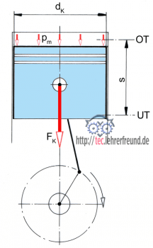 Bei der Leistungsberechnung geht man vereinfachend davon aus, dass der mittlere Verbrennungsdruck pm (in N/cm2) gleichbleibend über den gesamten Kolbenhub wirkt. Daraus entsteht die Kolbenkraft FK (in N):