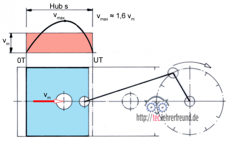 Die tatsächliche Kolbengeschwindigkeit folgt annähernd einer Sinuslinie. Sie hat v = 0 am oberen und unteren Totpunkt und eine Maximalgeschwindigkeit etwa in Hubmitte. Der Sinusverlauf wird in der praktischen Rechnung in die mittlere Kolbengeschwindigkeit vm umgewandelt: