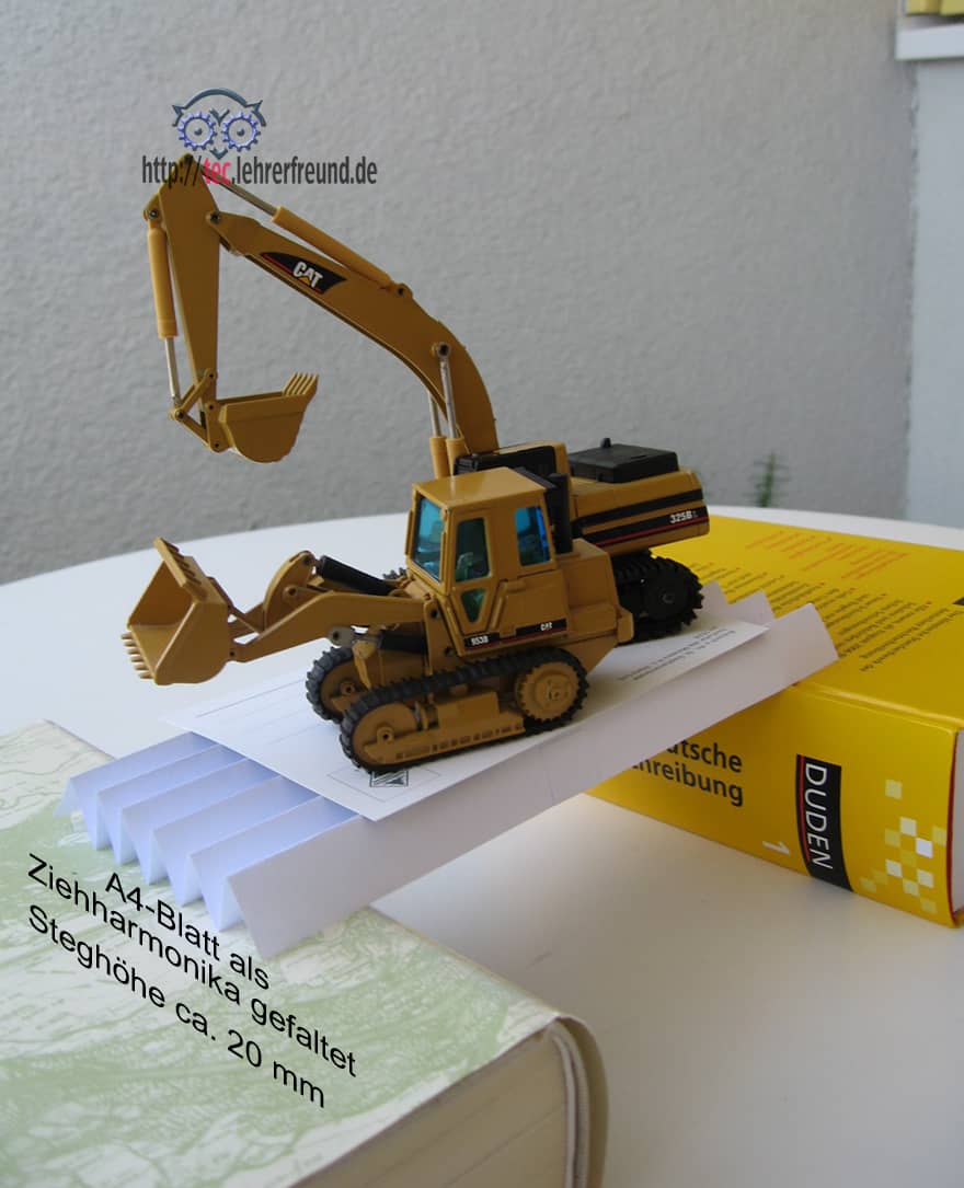 Zeichne auf die Blattbreite 12 parallele Linien im Abstand 20 mm übereinander. Falte das Blatt wie im Foto gezeigt. Klebe einen schmalen Streifen mit etwa 20 mm Breite von unten her auf die Ziehharmonika: Er verhindert, dass die einzelnen Falten bei Belastung seitlich weggedrückt werden. Eine Postkarte oben drauf gelegt dient als Plattform für Gewichte. Hier stehen Modellmaschinen aus Metallguss auf der Postkarte.
