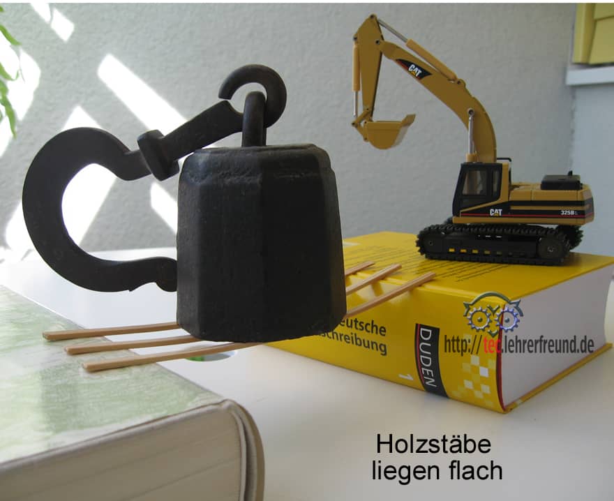 Wir stellen unseren etwa 3 kg schweren Gewichtsklotz auf drei flach abgelegte Stäbchen.