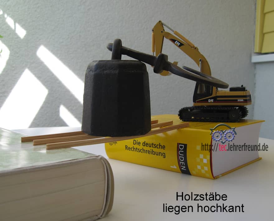 Wer sich damit auskennt, weiß, dass der hochkant gelegte Stab nicht nur die zweieinhalbfache Biegefestigkeit hat, sondern mindestens 15 Mal mehr Stabilität besitzt als der flach gelegte Stab (= 2,5 hoch drei).