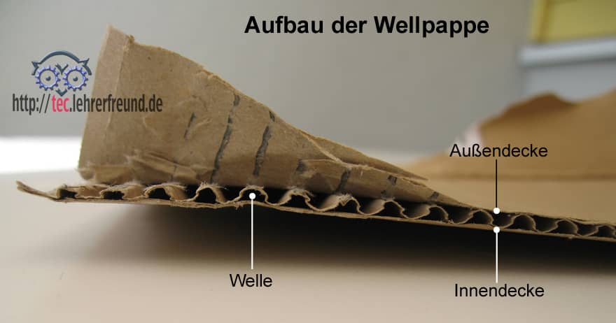 3. Wir brauchen also ein hohes Profil. Das lehrt uns auch die Wellpappe. Sie besteht aus drei miteinander verklebten Schichten, bei denen die mittlere, die «Welle«, die Hauptrolle spielt. Die Welle gibt der Pappe die oben angesprochene »Höhe« und ist gleichzeitig sehr leicht. Insgesamt ist die Pappe, obwohl sie aus Papier besteht, quer zur Welle erstaunlich biegesteif.