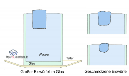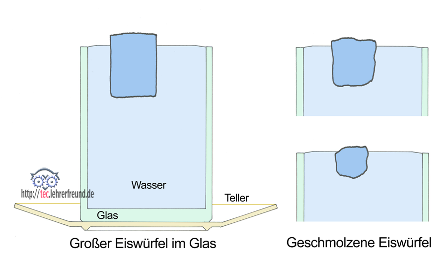 Beim Schmelzen im Glas verliert der Eiswürfel sein größeres Volumen wieder und nimmt genau den Raum ein, den der Eiswürfel im Wasser besaß.