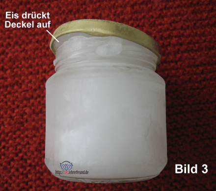 - hat das Eis den Deckel vom Glas weggedrückt (Bild 3). Zwischen Deckel und Becher entdeckt man den Eiskern; oder
